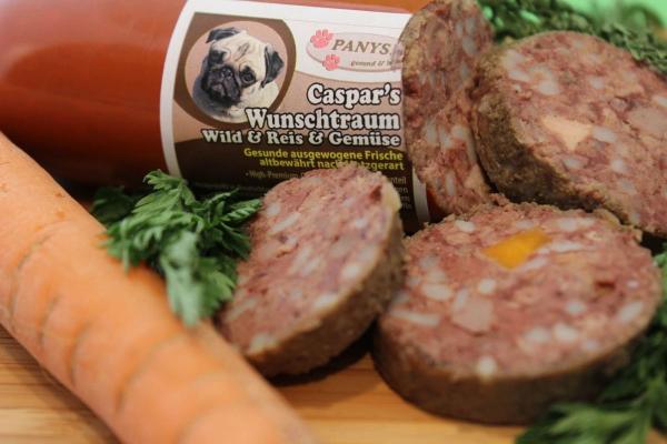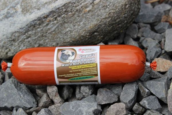 Da Caspars Wunschtraum eine glutenfreie Rezeptur ist, eignet sich auch diese Wurst ganz besonders für Hunde die Probleme mit Gluten haben. Dieses Gericht ist für alle ausgewachsenen Hunde als Alleinnahrung geeignet. Auch Ihr Welpe im Alter ab 3 Monaten darf die PANYS-Wurst auf 4-5 Mahlzeiten verteilt bekommen. Da Welpen während des Wachstums einen höheren Bedarf an Kohlenhydraten haben, sollten Sie auf alle Fälle noch Welpentrockenfutter zufüttern.