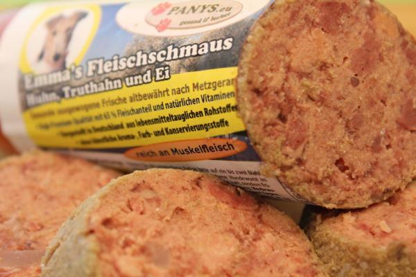 Hier handelt es sich um eine reine Fleischmahlzeit aus Huhn, Truthahn und Ei, getreidefreie/glutenfreie Rezeptur. diese Wurstsorte eignet sich ganz hervorragend für Hunde die Probleme mit Kohlenhydraten haben. Auch für Welpen im Alter ab 3 Mon. kann die Wurst auf 4-5 Mahlzeiten verteilt gefüttert werden. Allerdings sollten Sie dann noch Welpentrockenfutter zufüttern, da Welpen während des Wachstums noch zusätzliche Kohlenhydrate benötigen.