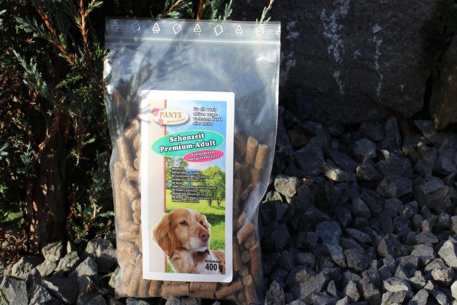 PANYS Schonzeit Premium-Adult kaltgepresst ist als Alleinnahrung für ausgewachsene Hunde aller Rassen mit reduziertem Energiebedarf, sowie für ältere Hunde zugelassen.